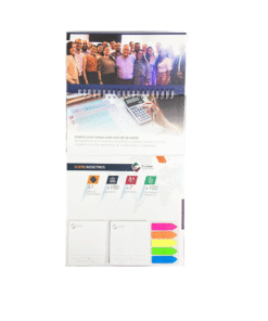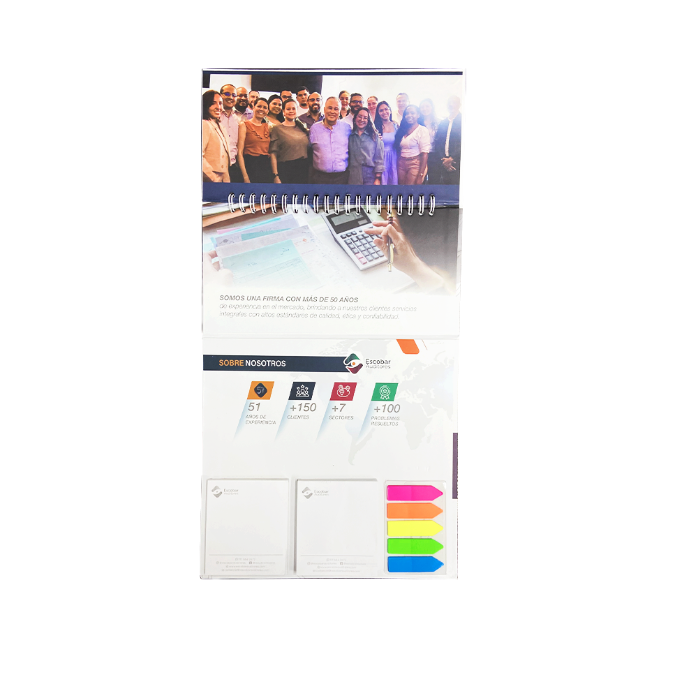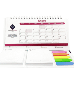 Calendario de 12 hojas de 19.6 x 9.6 cms. impresas en Propalcote de 150 grs. a 4×4 tintas con los doce meses del año totalmente personalizados con la imagen de su empresa. Incluye 2 tacos de notas de 6.6 x 7.5 cms. con 70 hojas engomadas impresas a 1×0 tintas en papel Bond de 70 grs. con la imagen de su empresa. (los dos tacos van impresos con el mismo diseño) y 1 set de 5 banderitas plásticas de colores. Base elaborada en pasta dura en cartón de 1 mm. impresas a full color en Propalcote de 150 grs. laminadas mate y personalizadas con la imagen de su empresa. Anillo doble O metálico.